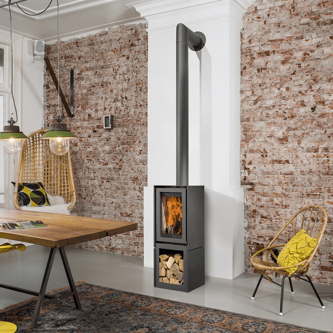 De Box 45 is een stoere kleine vrijstaande houtkachel met een houtopslagmodule. De kachel heeft een hoog rendement.