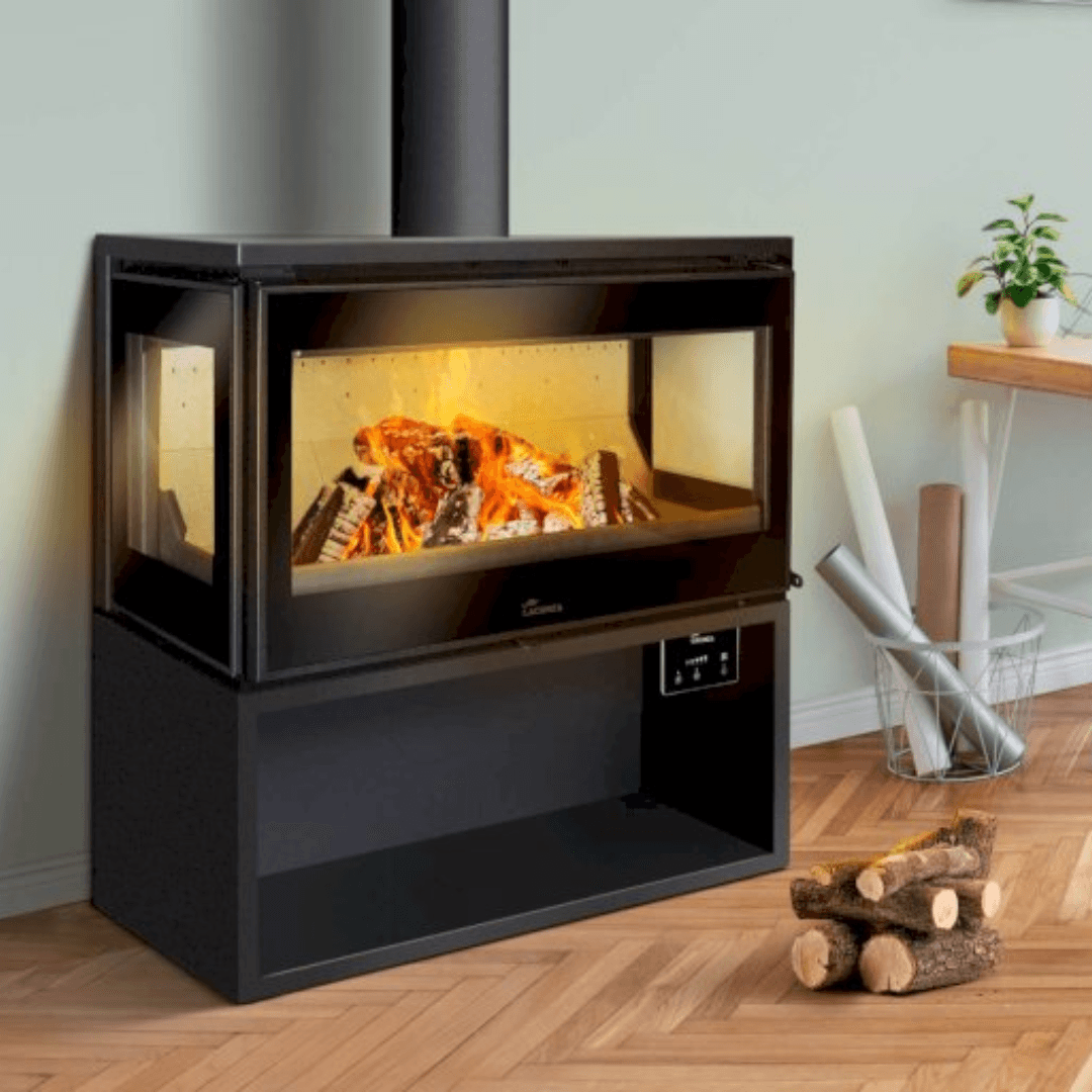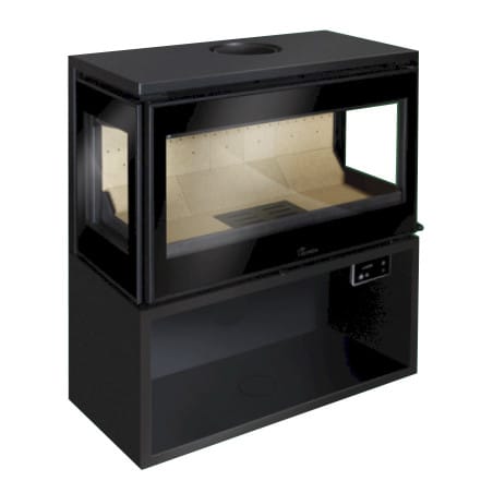 Een kachel met drie-zijdig zicht. De kachel heeft een geïntegreerd ventilatiesysteem die je zelf kan regelen. Hij is verkrijgbaar in een hangend model of een vrijstaande met houtvak.