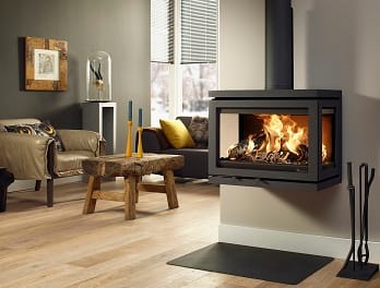 Deze 3-zijdige kachel is stoer en je hebt een mooi zicht op het vuur. Deze kachel kan geplaatst worden op een plateau. Omdat deze haard hangt geeft het een ruimtelijk zicht in de ruimte waar hij hangt. Door zijn hoge vermogen krijgt hij een ruimte snel behaagelijk warm.